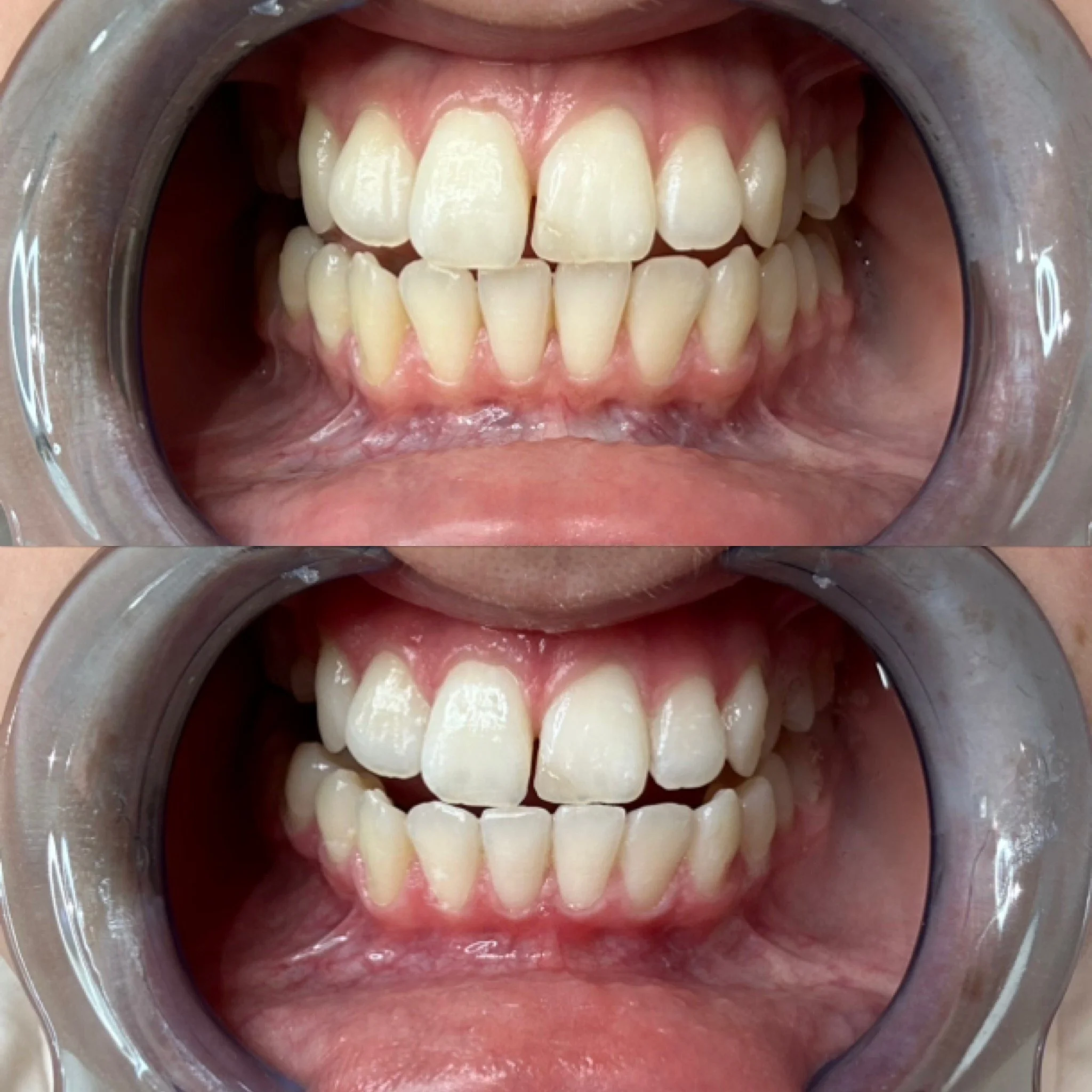 Our sensitive safe teeth whitening procedure will leave your teeth up to 3-4 shades lighter per appointment. The picture on the left is a before and after of our clients first ever triple treatment session. Contact us for a consultation, booking and/or treatment plan today.